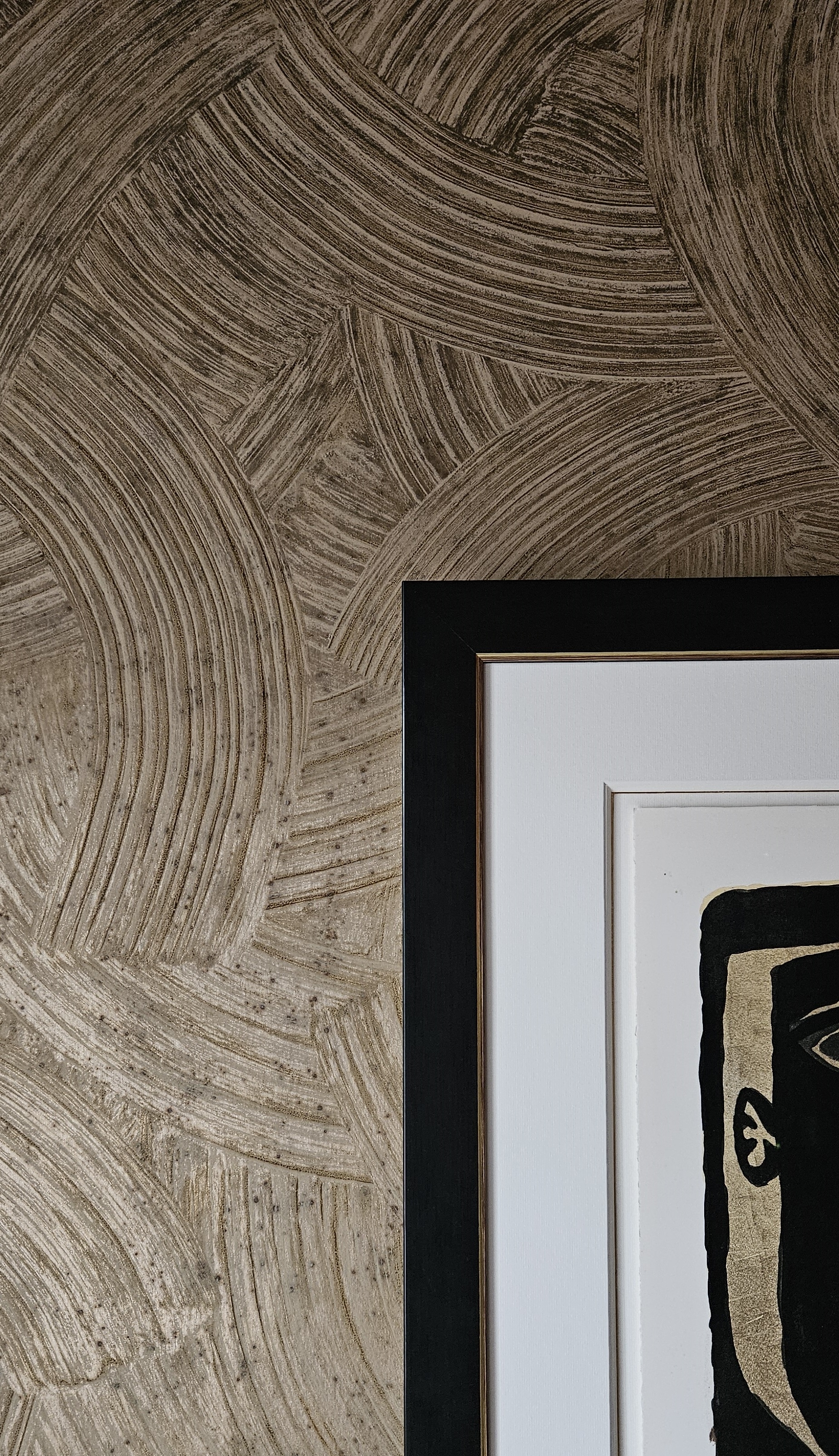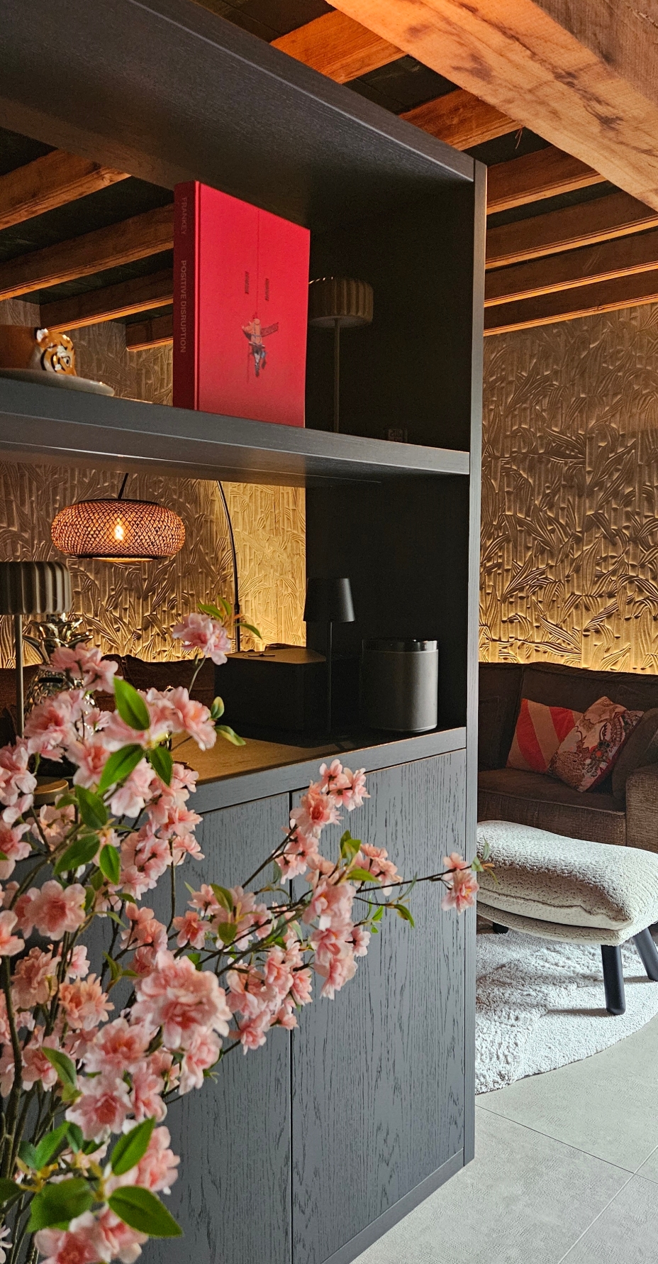 Van subtiele texturen tot opvallende prints: alle wanden die je ziet zijn behangen. Ook de zwevende kast is onderdeel van ons interieuradvies, een luchtige touch met veel impact.